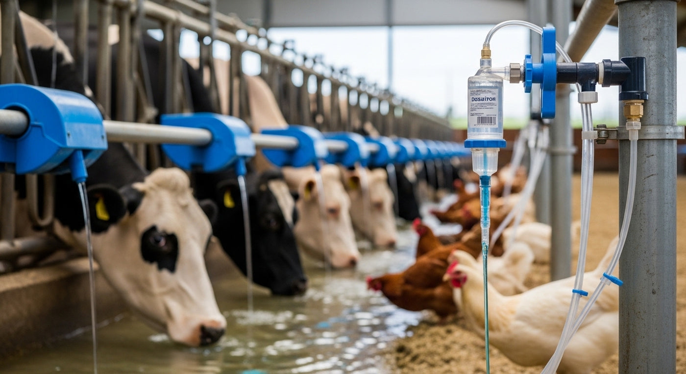 Livestock medication dosing is the process of administering soluble animal health products through drinking water systems. This can include vitamins, minerals, supplements, antibiotics, vaccines, disinfectants, or other approved treatments used in livestock production.